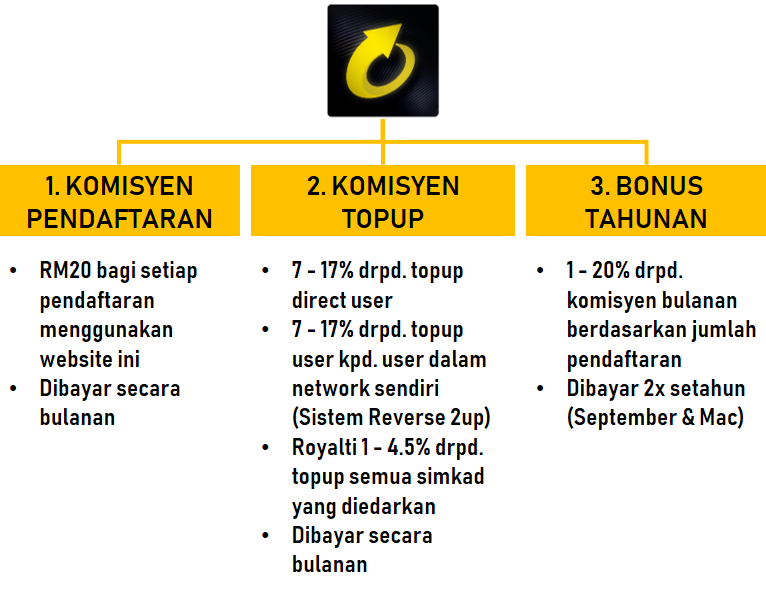 Dan yang paling best, tuan/puan juga akan dibayar royalti 1% - 4.5% ke atas topup semua simkad yang tuan/puan edarkan. Bayangkan jika 100 user direct tuan/puan daftarkan 100 lagi user baru setiap seorang.